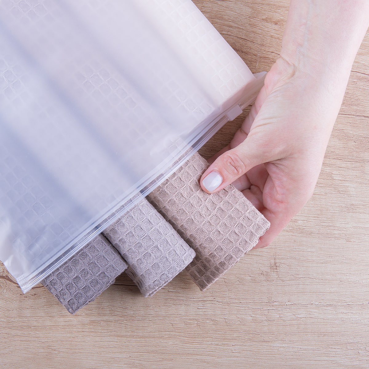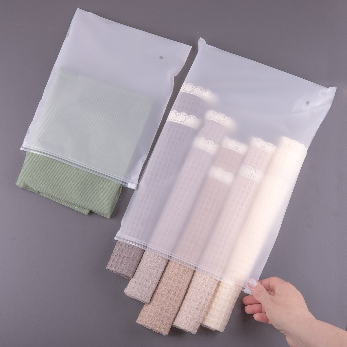 Матовые пакеты зип лок с бегунком - идеальный вариант для упаковки товаров, например, одежды. Пакет выполнен из материала EVA (ЭВА, этиленвинилацетат), он намного прочнее обычного полиэтилена, т.к. менее подвержен разрывам и проколам от острых предметов. Толщина такого зип пакета с бегунком составляет 70 мкр на одну сторону и 140 мкр на обе стороны. Наши зип локи многоразовые. Пакет матовый и очень мягкий на ощупь. Замок в виде бегунка плотно застегивает пакет, а два отверстия в нижней части пакета служат для стравливания воздуха, что позволяет сначала упаковать предметы одежды, а затем удалить воздух и значительно сократить объем упаковки. Пакеты можно использовать для хранения вещей дома и для упаковки вещей для продажи на маркетплейсах. В нашем ассортименте представлены все основные ходовые размеры под любые нужды: от небольших размеров для носков или нижнего белья (15 х 20 см) до крупных размеров для пуховиков (50 х 70 см). В упаковке 100 зип лок пакетов, за исключением размеров (40 х 50 см и 50 х 70 см),