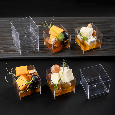 Одноразовые фуршетные формы для сервировки стола на праздники, банкеты, для фуршета, кейтеринга. Форма "Куб" имеет гладкую фактуру и текстуру, её приятно держать в руках. Используется в кафе, ресторанах, кондитерских и других заведениях общественного питания для подачи десертов, закусок, фуршетных блюд, комплиментов от шеф-повара, мороженого, салатов, соусов, джемов, сухих закусок. Рекомендуется использовать в температурном диапазоне от -10 °С до +70 °С. При сильном нагревании, выше 85°С, деформируется. Изготовлена из полистирола. Размеры формы:44х44х43 мм . Объём: 60 мл. Цвет: прозрачный.