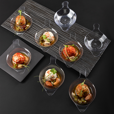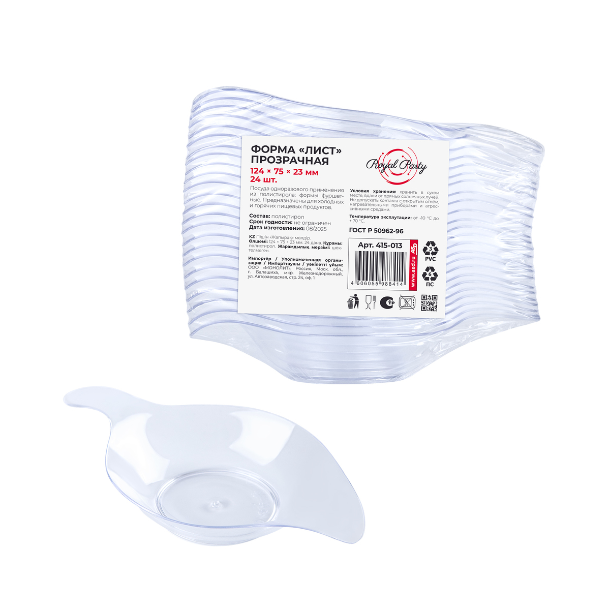 Одноразовые фуршетные формы для сервировки стола на праздники, банкеты, для фуршета, кейтеринга. Форма "Лист" имеет гладкую фактуру и текстуру, её приятно держать в руках. Используется в кафе, ресторанах, кондитерских и других заведениях общественного питания для подачи десертов, закусок, фуршетных блюд, комплиментов от шеф-повара, мороженого, салатов, соусов, джемов, сухих закусок. Рекомендуется использовать в температурном диапазоне от -10 °С до +70 °С. При сильном нагревании, выше 85°С, деформируется. Изготовлена из полистирола. Размеры формы: 128х75х23 мм. Цвет: прозрачный.
