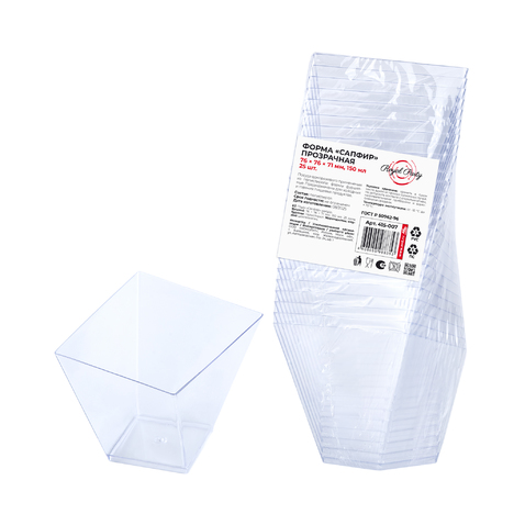 Одноразовые фуршетные формы для сервировки стола на праздники, банкеты, для фуршета, кейтеринга. Форма "Сапфир" имеет гладкую фактуру и текстуру, её приятно держать в руках. Используется в кафе, ресторанах, кондитерских и других заведениях общественного питания для подачи десертов, закусок, фуршетных блюд, комплиментов от шеф-повара, мороженого, салатов, соусов, джемов, сухих закусок. Рекомендуется использовать в температурном диапазоне от -10 °С до +70 °С. При сильном нагревании, выше 85°С, деформируется. Изготовлена из полистирола. Размеры формы:76х76х71 мм,. Объём: 150 мл. Цвет: прозрачный.