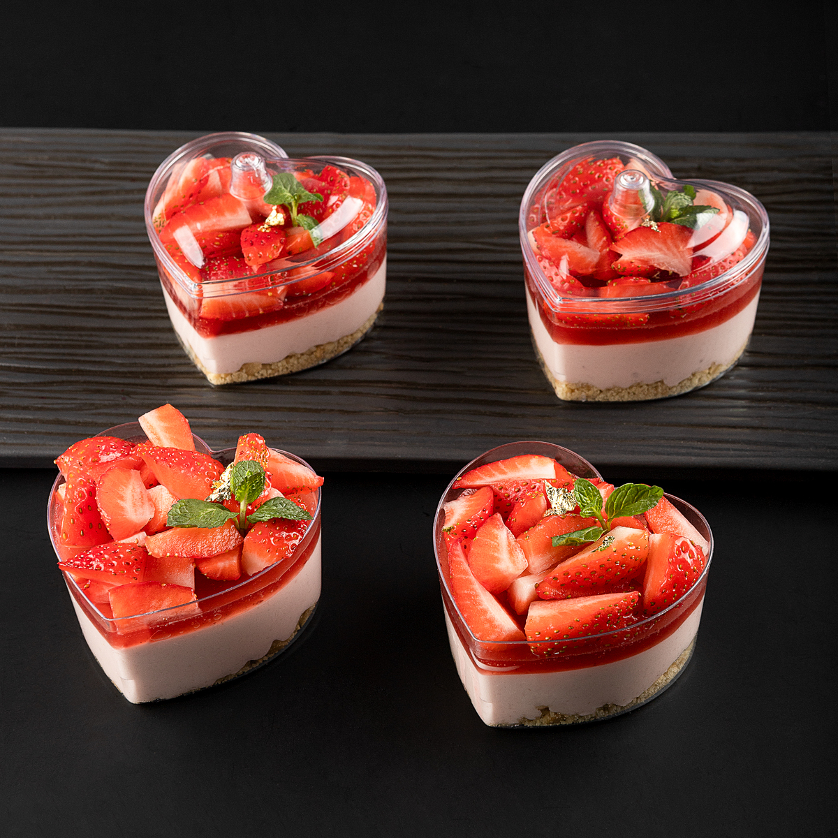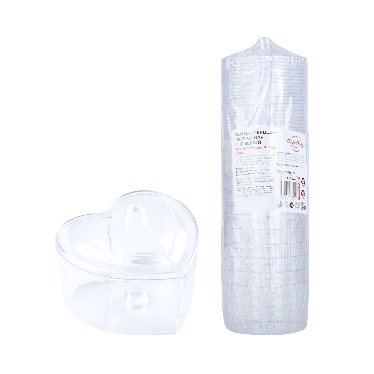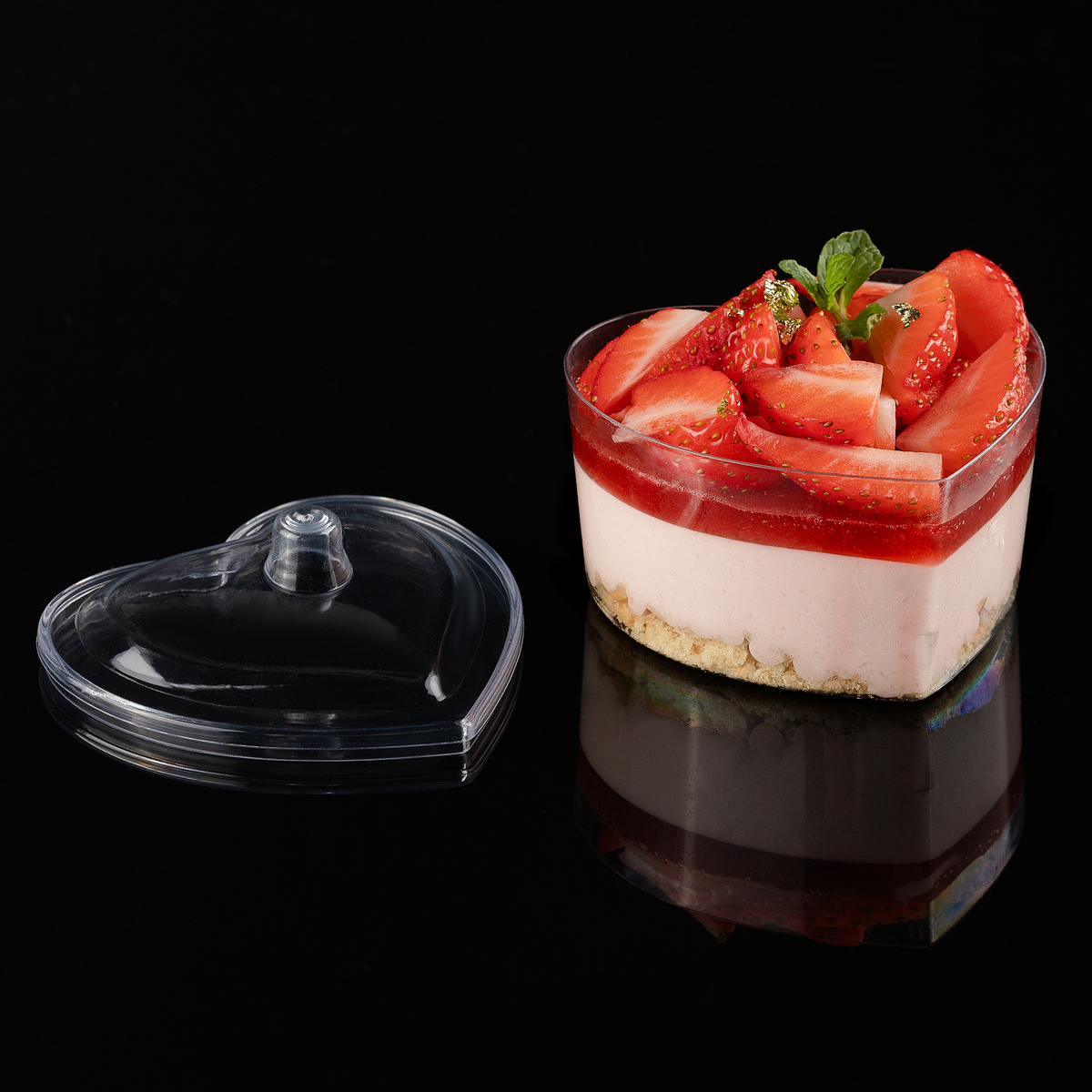 Одноразовые фуршетные формы для сервировки стола на праздники, банкеты, для фуршета, кейтеринга.Форма "Сердце" с крышкой имеет гладкую фактуру и текстуру, её приятно держать в руках. Используется в кафе, ресторанах, кондитерских и других заведениях общественного питания для подачи десертов, закусок, фуршетных блюд, комплиментов от шеф-повара, мороженого, салатов, соусов, джемов, сухих закусок. Рекомендуется использовать в температурном диапазоне от -10 °С до +70 °С. При сильном нагревании, выше 85°С, деформируется. Изготовлена из полистирола. Размеры формы: 70х65х57 мм. Объём: 100 мл. Цвет: прозрачный.