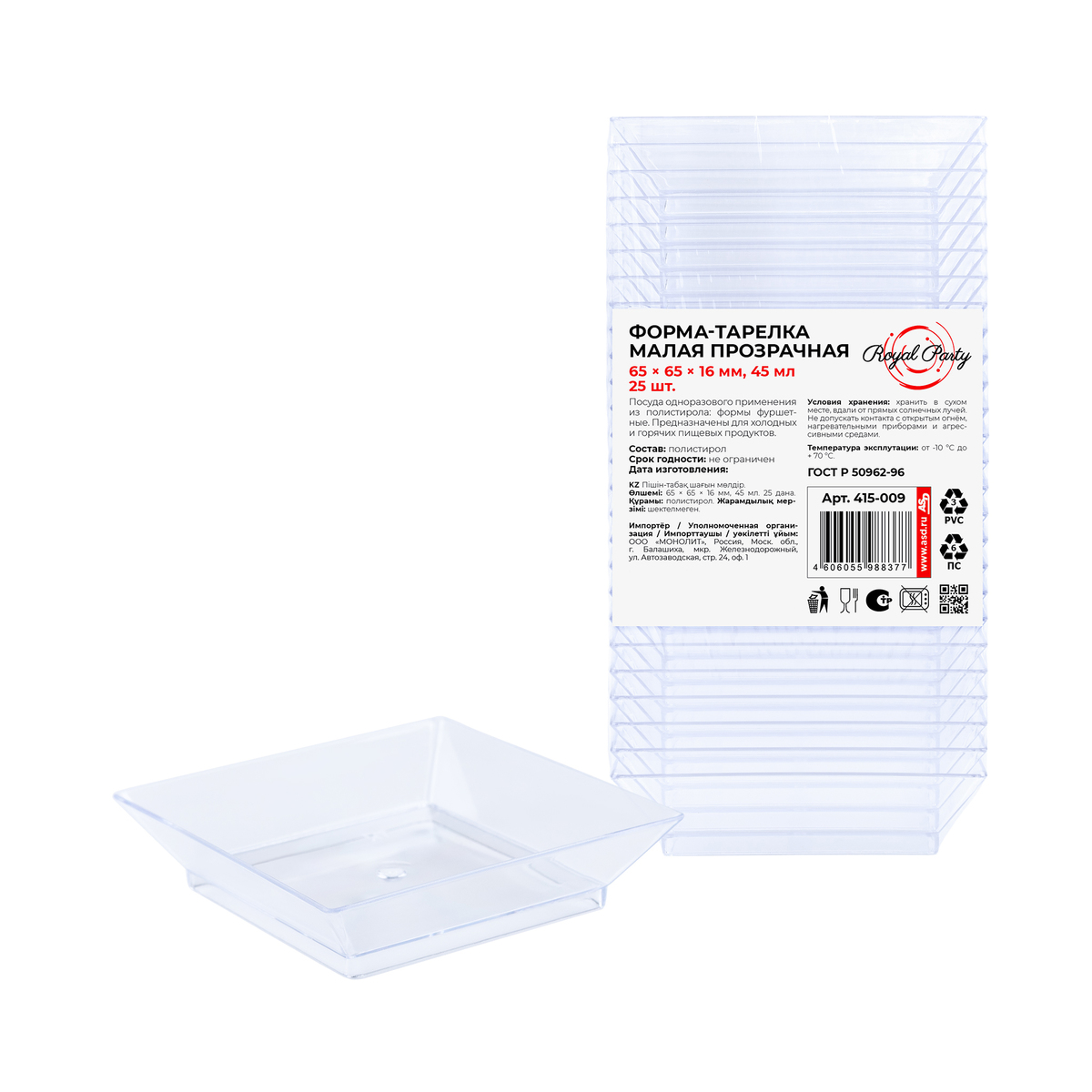 Одноразовые фуршетные формы для сервировки стола на праздники, банкеты, для фуршета, кейтеринга. Форма "Тарелка" малая имеет гладкую фактуру и текстуру, её приятно держать в руках. Используется в кафе, ресторанах, кондитерских и других заведениях общественного питания для подачи десертов, закусок, фуршетных блюд, комплиментов от шеф-повара, мороженого, салатов, соусов, джемов, сухих закусок. Рекомендуется использовать в температурном диапазоне от -10 °С до +70 °С. При сильном нагревании, выше 85°С, деформируется. Изготовлена из полистирола. Размеры формы: 65х65х16 мм. Объём: 45 мл. Цвет: прозрачный.