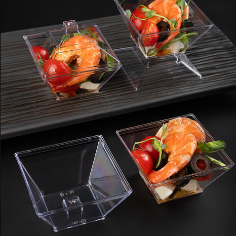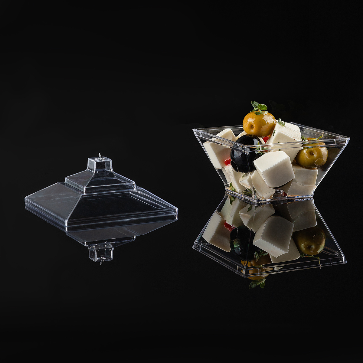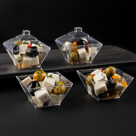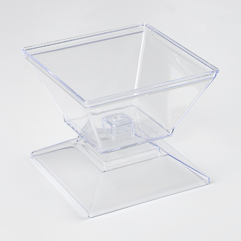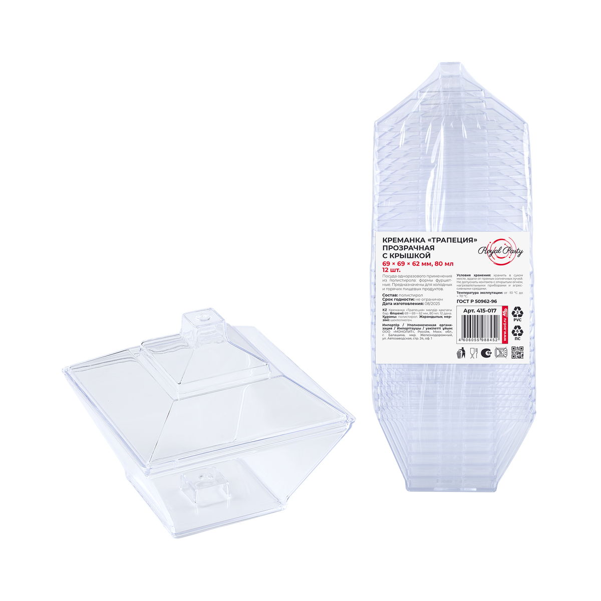 Одноразовые фуршетные формы для сервировки стола на праздники, банкеты, для фуршета, кейтеринга. Креманка "Трапеция" с крышкой имеет гладкую фактуру и текстуру, её приятно держать в руках. Используется в кафе, ресторанах, кондитерских и других заведениях общественного питания для подачи десертов, закусок, фуршетных блюд, комплиментов от шеф-повара, мороженого, салатов, соусов, джемов, сухих закусок. Рекомендуется использовать в температурном диапазоне от -10 °С до +70 °С. При сильном нагревании, выше 85°С, деформируется. Изготовлена из полистирола. Размеры формы: 69x69х62 мм. Объём: 80 мл. Цвет: прозрачный.