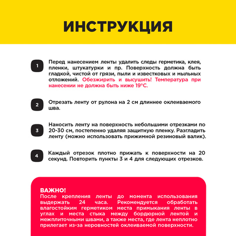 - Клеевой состав нанесен по всей ширине ленты, что позволяет исключить ее преждевременное отслаивание