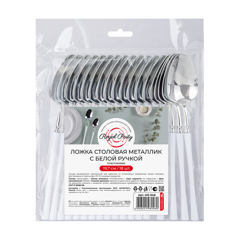 Ложка столовая металлизированная для одноразового применения из полистирола. Предназначена для холодных и горячих (до +70°С) пищевых продуктов. Визуально ложки мало чем отличаются от привычных ложек из нержавеющей стали, а потому довольно привлекательно смотрятся в сервировке. Выгоды подобного приема очевидны: Вам не нужно постоянно тратиться на мытье и дезинфекцию столовых приборов. Металлизированные ложки отлично вписываются в любое сервировочное решение, причем их можно использовать не только в уличных кафе, но и при организации кейтеринга, в различных фуд-кортах и других подобных мероприятиях. Приборы экологически безопасны и достаточно прочны. Не допускать контакта с открытым огнем, нагревательными приборами и агрессивными средами. Длина 19,7 см, 18 штук в упаковке.