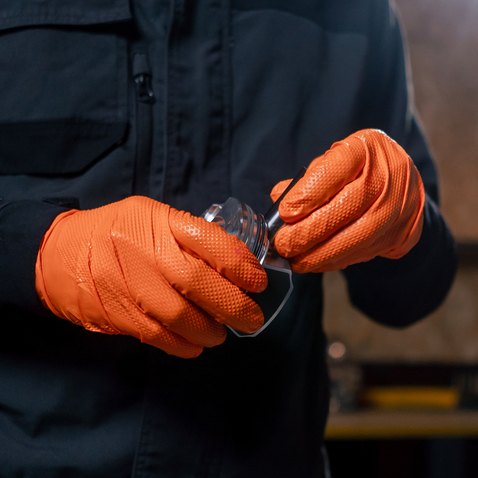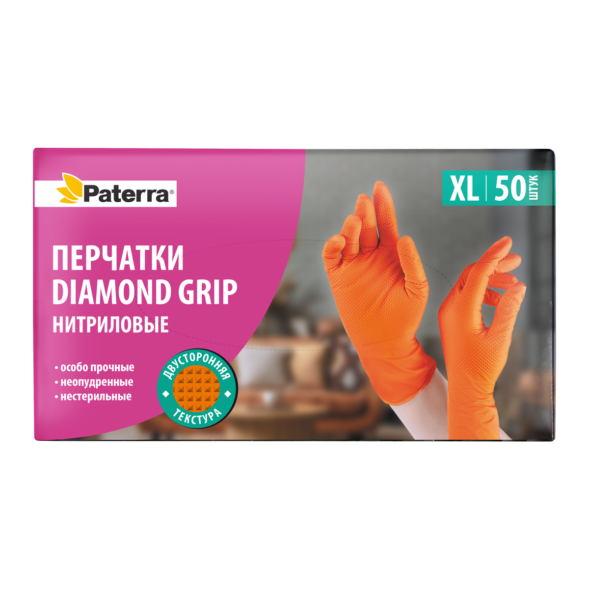 Нитриловые перчатки Алмазный хват (Diamond Grip) – это особо прочные, устойчивые к разрывам и повреждениям перчатки. Они в три раза плотнее, чем обычные нитриловые перчатки. Ромбовидная текстура обеспечивает удобный захват и отсутствие проскальзывания. Текстура в области пальцев обеспечивает надежную фиксацию инструмента. Имеют высокую устойчивость к воздействую масел, спиртов и различных химических составов (продуктов нефтепереработки при различных видах работ). Обладают хорошей износостойкостью и прочностью, что позволяет работать в них гораздо дольше. Материал не вызывает аллергии. Отличная сенсорная чувствительность при работе с гаджетами. Предназначены для защиты кожи рук при обработке пищевых продуктов, уборке, в сельском хозяйстве, полиграфии, строительстве, автомобильной промышленности, гальванике, очистке отходов, в домашнем хозяйстве.