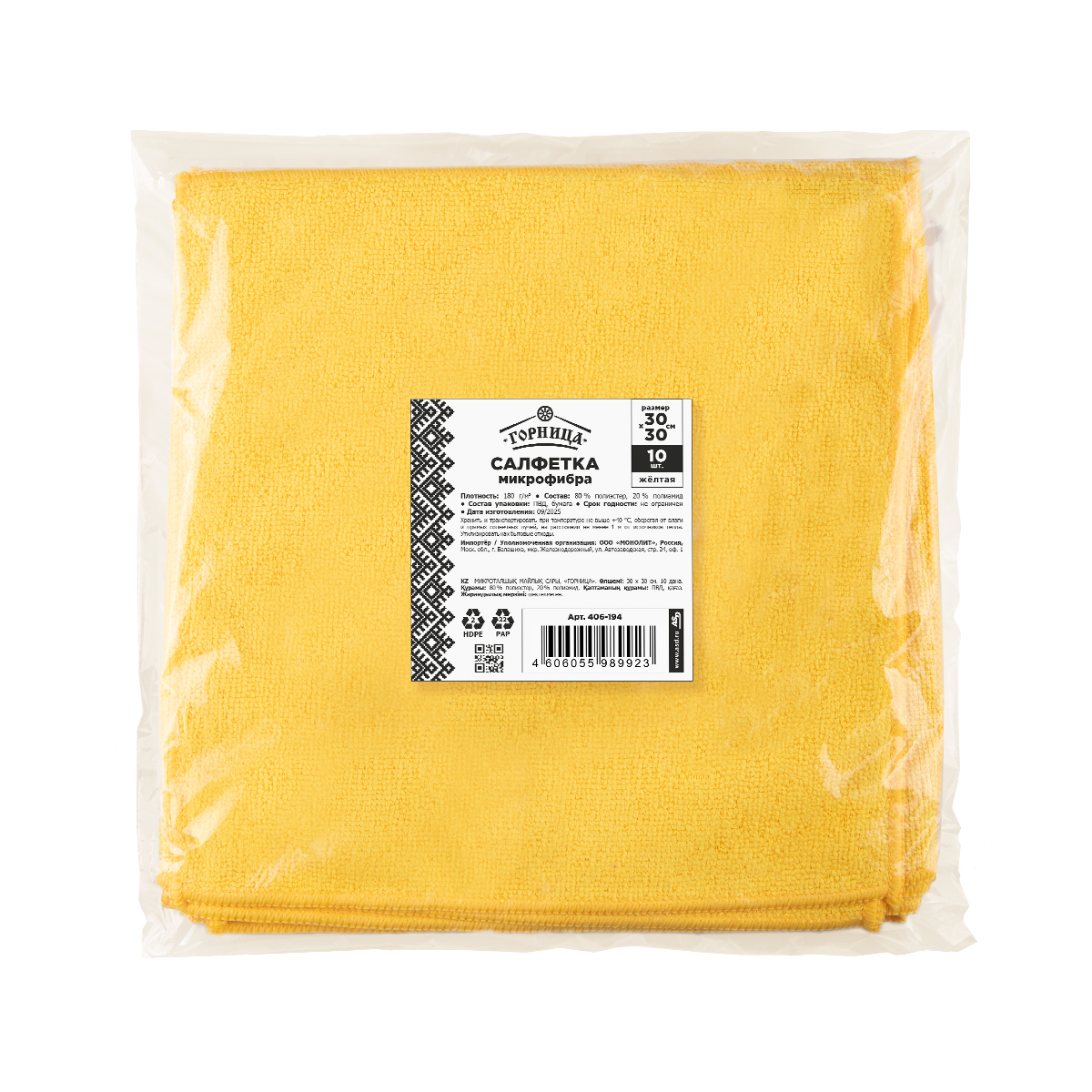 Салфетка из микрофибры «ГОРНИЦА» - это универсальное средство для ухода за поверхностями, позволяющее производить уборку без использования чистящих средств или с их минимальным количеством. Cалфетки предназначены для сухой и влажной уборки. Благодаря высокой плотности (180 г/м2) салфетки отлично впитывают влагу и эффективно удаляют загрязнения с различных поверхностей. Выдерживают до 300 циклов стирки. Салфетка из микрофибры под брендом «ГОРНИЦА» используется как в домашних условиях, так и в профессиональной сфере: в клининговых компаниях, ресторанах, магазинах, образовательных и медицинских учреждениях, в индустрии красоты и здоровья. В упаковке - 10 салфеток жёлтого цвета.