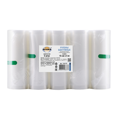 Рулоны вакуумные AVIORA предназначены для вакуумирования продуктов питания, например, овощей и фруктов, мяса и рыбы, орехов и ягод, и т.д. Рулоны вакуумные идеально подходят для маринования мяса и рыбы. Рулон представляет собой рукав длиной 5 метров, запаянный по бокам. Одна внутренняя стенка рулона гладкая, другая внутренняя стенка - рифленая. Такие насечки на одной из стенок позволяют лучше откачивать воздух при вакуумировании. Толщина гладкой стороны составляет 80 мкм, толщина рифленой стороны - 100 мкм. Для использования отрезать необходимую длину, запаять с одной стороны, разместить продукты, поместить в вакууматор, который откачает воздух и запаяет пакет. В таком виде продукты хранятся в несколько раз дольше, сохраняются вкусовые свойства и свежесть. Рулоны подходят для любых бытовых вакууматоров. Не подходят для запекания. Не содержит бисфенол А (BPA free).