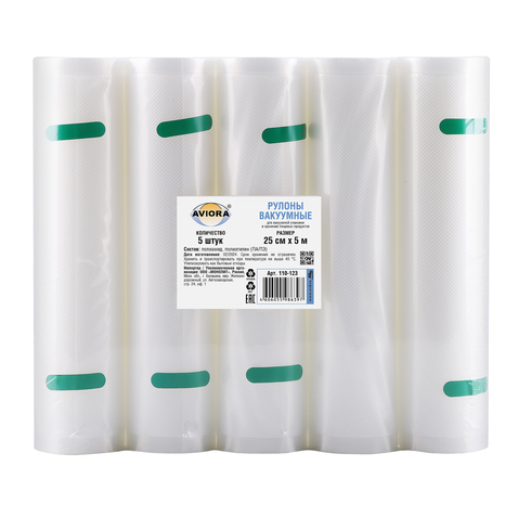 Рулоны вакуумные AVIORA предназначены для вакуумирования продуктов питания, например, овощей и фруктов, мяса и рыбы, орехов и ягод, и т.д. Рулоны вакуумные идеально подходят для маринования мяса и рыбы. Рулон представляет собой рукав длиной 5 метров, запаянный по бокам. Одна внутренняя стенка рулона гладкая, другая внутренняя стенка - рифленая. Такие насечки на одной из стенок позволяют лучше откачивать воздух при вакуумировании. Толщина гладкой стороны составляет 80 мкм, толщина рифленой стороны - 100 мкм. Для использования отрезать необходимую длину, запаять с одной стороны, разместить продукты, поместить в вакууматор, который откачает воздух и запаяет пакет. В таком виде продукты хранятся в несколько раз дольше, сохраняются вкусовые свойства и свежесть. Рулоны подходят для любых бытовых вакууматоров. Не подходят для запекания. Не содержит бисфенол А (BPA free).