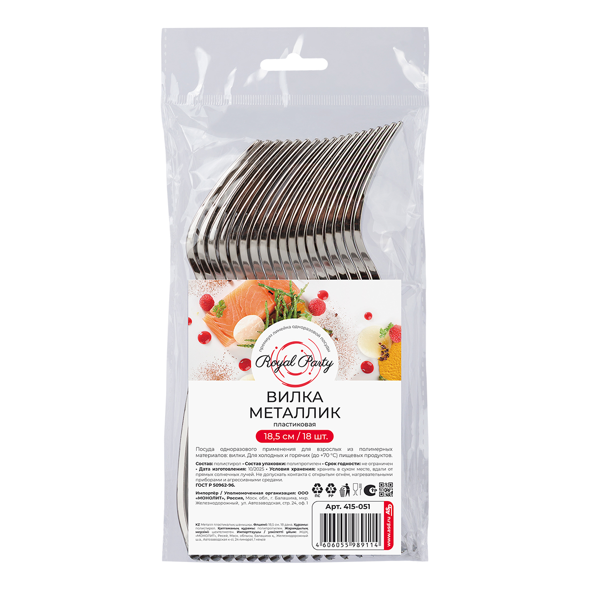 Вилка металлизированная для одноразового применения из полистирола. Предназначена для холодных и горячих (до +70°С) пищевых продуктов. Визуально вилки мало чем отличаются от привычных вилок и ложек из нержавеющей стали, а потому довольно привлекательно смотрятся в сервировке. Выгоды подобного приема очевидны: Вам не нужно постоянно тратиться на мытье и дезинфекцию столовых приборов. Металлизированные вилки отлично вписываются в любое сервировочное решение, причем их можно использовать не только в уличных кафе, но и при организации кейтеринга, в различных фуд-кортах и других подобных мероприятиях. Приборы экологически безопасны и достаточно прочны для того, чтобы без проблем справиться с любым вторым блюдом или десертом. Не допускать контакта с открытым огнем, нагревательными приборами и агрессивными средами. Длина 18,5 см, 18 штук в упаковке.