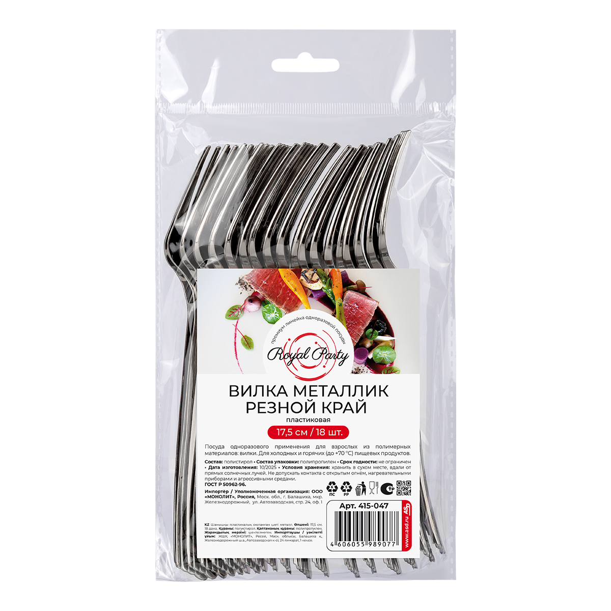 Вилка металлизированная для одноразового применения из полистирола. Предназначена для холодных и горячих (до +70°С) пищевых продуктов. Визуально вилки мало чем отличаются от привычных вилок и ложек из нержавеющей стали, а потому довольно привлекательно смотрятся в сервировке. Выгоды подобного приема очевидны: Вам не нужно постоянно тратиться на мытье и дезинфекцию столовых приборов. Металлизированные вилки отлично вписываются в любое сервировочное решение, причем их можно использовать не только в уличных кафе, но и при организации кейтеринга, в различных фуд-кортах и других подобных мероприятиях. Приборы экологически безопасны и достаточно прочны для того, чтобы без проблем справиться с любым вторым блюдом или десертом. Не допускать контакта с открытым огнем, нагревательными приборами и агрессивными средами. Длина 17,5 см, 18 штук в упаковке.